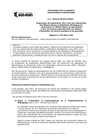 Le présent rapport a pour objet de proposer l'adoption du programme de coopération avec les collectivités des régions Boeny et Betsiboka (Madagascar), pour 2011, ainsi que l'attribution d'une subvention à l'Institut Régional de Coopération-Développement et l'approbation d'une convention opérationnelle en matière d'éducation, de lecture publique et de jeunesse, nécessaires pour la mise en oeuvre de ce programme.