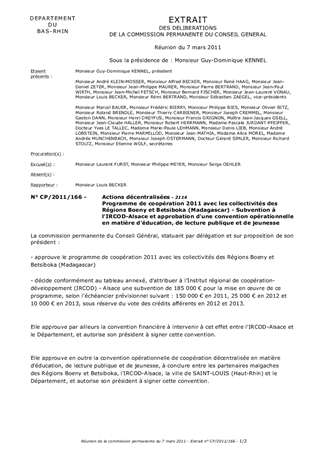 Programme de coopération 2011 avec les collectivités des Régions Boeny et Betsiboka (Madagascar) - Subvention à l'IRCOD-Alsace et approbation d'une convention opérationnelle en matière d'éducation, de lecture publique et de jeunesse