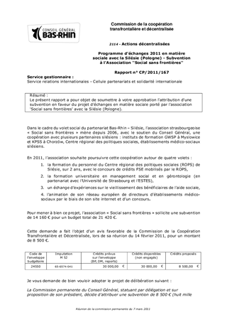 Le présent rapport a pour objet de soumettre à votre approbation l'attribution d'une subvention en faveur du projet d'échanges en matière sociale porté par l'association 'Social sans frontières' avec la Silésie (Pologne).