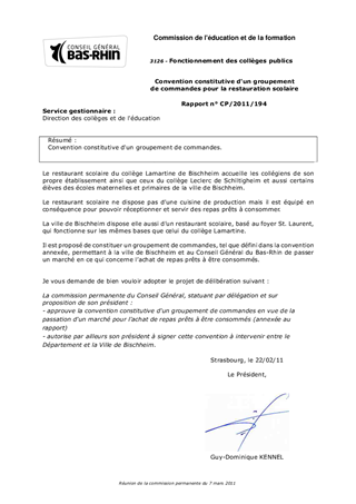 Convention constitutive d'un groupement de commandes pour la restauration scolaire Resumé Convention constitutive d'un groupement de commandes. Pièces jointes Délibération Rapport Assemblée : Commission Permanente Date : 07/03/2011 Rapporteur : Monsieur Marcel BAUER Collectivité : Conseil départemental du Bas-Rhin Direction : Pôle épanouissement de la personne Service : Direction des collèges et de l'éducation Domaine : Non renseigné Commission : G - Commission de l'éducation et de la formation