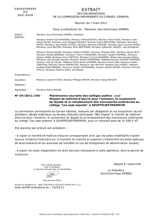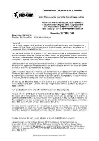 Le présent rapport vise à attribuer le marché de maîtrise duvre pour lisolation, le ravalement de façade et le remplacement des menuiseries extérieures au collège les 7 arpents à SOUFFELWEYERSHEIM.