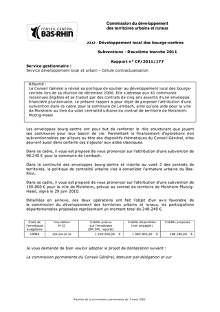 Le Conseil Général a révisé sa politique de soutien au développement local des bourgs-centres lors de sa réunion de décembre 2000. Elle s'adresse aux 41 communes reconnues éligibles et se traduit par des contrats de cinq ans assortis d'une enveloppe financière pluriannuelle. Le présent rapport a pour objet de proposer lattribution dune subvention dans ce cadre pour la commune de Lembach, ainsi qu'une aide pour la ville de Molsheim au titre du volet centralité urbaine du contrat de territoire de Molsheim-Mutzig-Hasel.