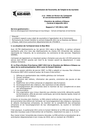 Le présent rapport a pour objet de soumettre à l'approbation de la Commission Permanente du Conseil Général le contrat d'objectifs 2011 de la Chambre de Métiers d'Alsace, doté d'une subvention départementale de 170.000 €.