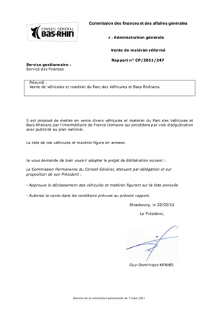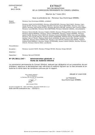 Vente de matériel réformé Resumé Vente de véhicules et matériel du Parc des Véhicules et Bacs Rhénans. Pièces jointes Délibération Rapport Assemblée : Commission Permanente Date : 07/03/2011 Rapporteur : Monsieur Bernard FISCHER Collectivité : Conseil départemental du Bas-Rhin Direction : Direction des finances et de la commande publique Service : Service des finances Domaine : Non renseigné Commission : L - Commission des finances et des affaires générales