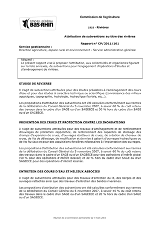 Le présent rapport vise à proposer lattribution, aux collectivités et organismes figurant sur la liste annexée, de subventions pour lengagement dopérations détudes et daménagement de rivières.