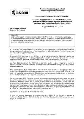 Le présent rapport concerne la demande d'aide financière de l'Institut européen pour le conseil en environnement ECO-Conseil, dans le cadre d'un chantier d'application sur la thématique de l'analyse et des préconisation relatives aux différents outils de lutte contre la précarité énergétique.