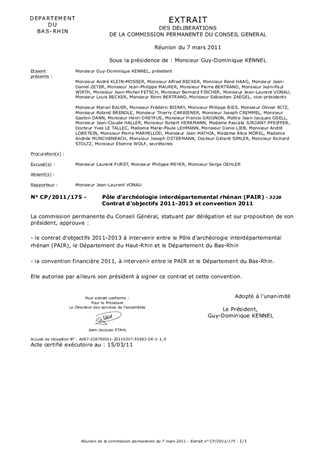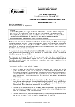 Le présent rapport a pour objet d'autoriser le Président à signer le contrat d'objectifs 2011-2013 à conclure entre, d'une part, le Pôle d'Archéologie Interdépartemental Rhénan (PAIR) et, d'autre part, les deux Départements du Bas-Rhin et du Haut-Rhin. Ce contrat précise les enjeux et missions du PAIR ainsi que les orientations stratégiques de cet établissement public interdépartemental.