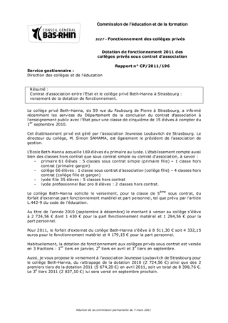 Contrat d'association entre l'Etat et le collège privé Beth-Hanna à Strasbourg : versement de la dotation de fonctionnement.
