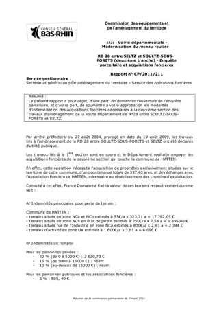 Le présent rapport a pour objet, d'une part, de demander l'ouverture de l'enquête parcellaire, et d'autre part, de soumettre à votre approbation les modalités d'indemnisation des acquisitions foncières nécessaires à la deuxième section des travaux d'aménagement de la Route Départementale N°28 entre SOULTZ-SOUS-FORÊTS et SELTZ.