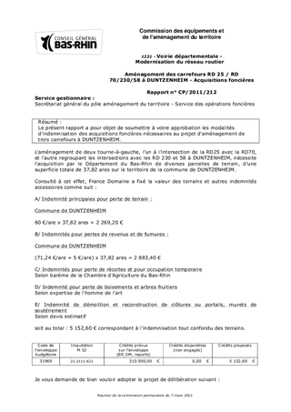 Le présent rapport a pour objet de soumettre à votre approbation les modalités d'indemnisation des acquisitions foncières nécessaires au projet d'aménagement de trois carrefours à DUNTZENHEIM.