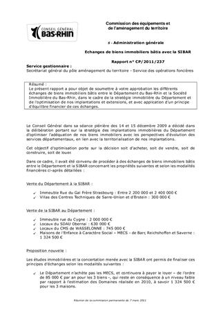 Le présent rapport a pour objet de soumettre à votre approbation les différents échanges de biens immobiliers bâtis entre le Département du Bas-Rhin et la Société Immobilière du Bas-Rhin, dans le cadre de la stratégie immobilière du Département et de l'optimisation de nos implantations et extensions, et avec application d'un principe d'équilibre financier de ces échanges.