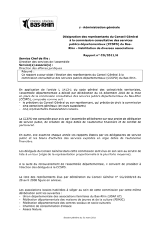 Ce rapport a pour objet l'élection des représentants du Conseil Général à la commission consultative des services publics départementaux (CCSPD) du Bas-Rhin.