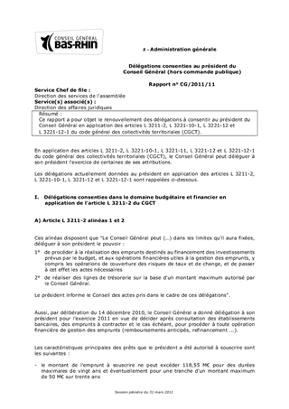 Ce rapport a pour objet le renouvellement des délégations à consentir au président du Conseil Général en application des articles L 3211-2, L 3221-10-1, L 3221-12 et L 3221-12-1 du code général des collectivités territoriales (CGCT).
