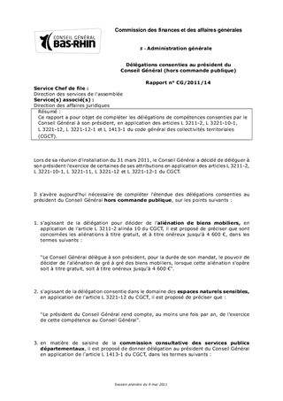 Ce rapport a pour objet de compléter les délégations de compétences consenties par le Conseil Général à son président, en application des articles L 3211-2, L 3221-10-1, L 3221-12, L 3221-12-1 et L 1413-1 du code général des collectivités territoriales (CGCT).