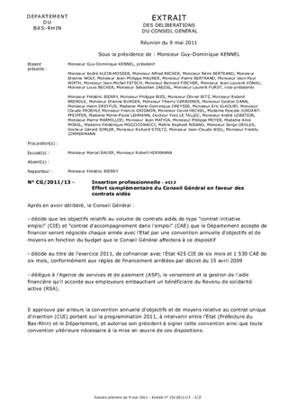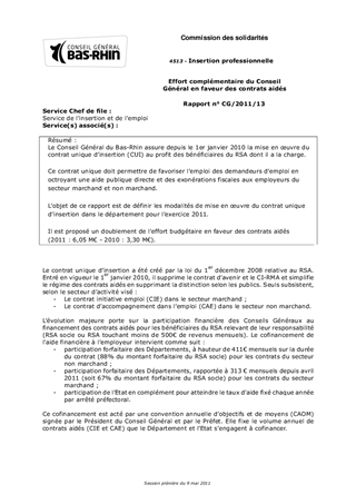 Le Conseil Général du Bas-Rhin assure depuis le 1er janvier 2010 la mise en uvre du contrat unique dinsertion (CUI) au profit des bénéficiaires du RSA dont il a la charge. Ce contrat unique doit permettre de favoriser lemploi des demandeurs demploi en octroyant une aide publique directe et des exonérations fiscales aux employeurs du secteur marchand et non marchand. Lobjet de ce rapport est de définir les modalités de mise en uvre du contrat unique dinsertion dans le département pour lexercice 2011. Il est proposé un doublement de l'effort budgétaire en faveur des contrats aidés (2011 : 6,05 M€ - 2010 : 3,30 M€).
