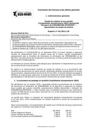 Le présent rapport a pour objet de soumettre à votre Assemblée lapprobation du projet de statuts de la future société dexploitation aéroportuaire dénommée «Aéroport de STRASBOURG-ENTZHEIM» dans laquelle la collectivité départementale entrera au capital à hauteur de 7.400 € (5 %) des parts sociales.