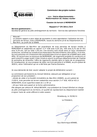 Le présent rapport a pour objet de soumettre à votre approbation l'aliénation de trois parcelles de terrain, sises à NORDHEIM, issues du domaine privé du Département du Bas-Rhin, au profit de la SIBAR.