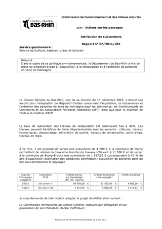 Dans le cadre de sa politique environnementale, le Département du Bas-Rhin a mis en place un dispositif d'aide à l'acquisition, à la restauration et à l'entretien de parcelles en zone de montagne.