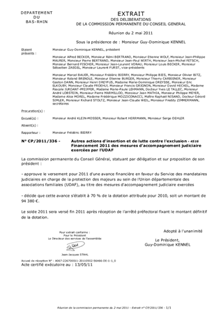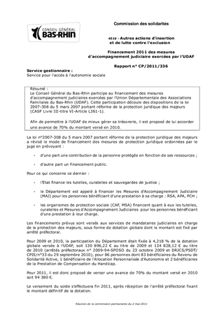 Le Conseil Général du Bas-Rhin participe au financement des mesures daccompagnement judiciaires exercées par lUnion Départementale des Associations Familiales du Bas-Rhin (UDAF). Cette participation découle des dispositions de la loi 2007-308 du 5 mars 2007 portant réforme de la protection juridique des majeurs (CASF Livre III-titre VI-Article L361-1). Afin de permettre à lUDAF de mieux gérer sa trésorerie, il est proposé de lui accorder une avance de 70% du montant versé en 2010.