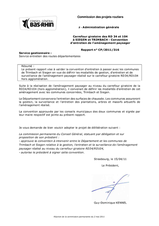 Le présent rapport vise à valider la convention d'entretien à passer avec les communes de Trimbach et Siegen en vue de définir les modalités de gestion, d'entretien et de surveillance de l'aménagement paysager réalisé sur le carrefour giratoire RD34/RD104 hors agglomération.