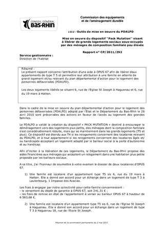 Le présent rapport concerne lattribution dune aide à OPUS 67 afin de libérer deux appartements de type T 5 et permettre leur attribution à une famille en attente de grand logement et/ou relevant du plan départemental d'action pour le logement des personnes défavorisées (PDALPD). Les deux logements libérés se situent 6, rue de lEglise St Joseph à Haguenau et 6, rue du 19 mars à Hatten.
