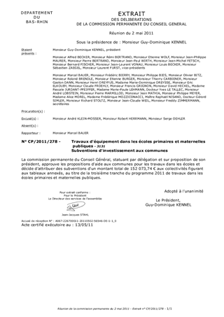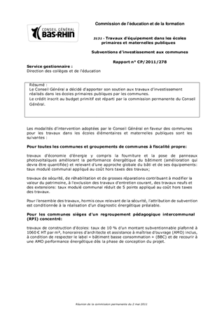 Le Conseil Général a décidé d'apporter son soutien aux travaux d'investissement réalisés dans les écoles primaires publiques par les communes. Le crédit inscrit au budget primitif est réparti par la commission permanente du Conseil Général.