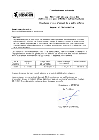 Le présent rapport a pour objet de présenter des demandes de subventions pour des investissements réalisés par plusieurs associations à Strasbourg dont la Buissonnière de l'Aar, la crèche parentale la Petite Bulle, la Flûte Enchantée ainsi que l'association d'Action Sociale du Bas-Rhin dans le domaine de l'aide aux structures privées d'accueil de la petite enfance