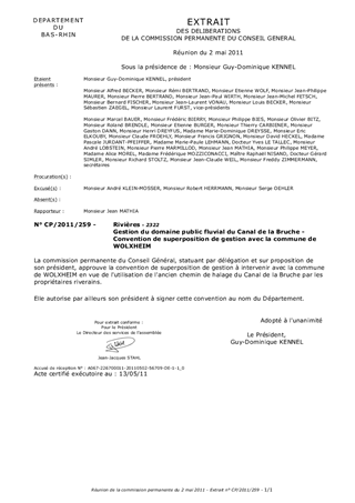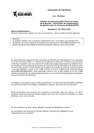 Le présent rapport vise à proposer lapprobation de la convention de superposition de gestion qui a pour objet de permettre à la commune de WOLXHEIM daffecter des parties de chemin de halage du canal de la Bruche dans sa voirie communale.