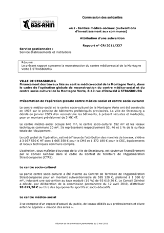 Attribution d'une subvention Resumé Le présent rapport concerne la reconstruction du centre médico-social de la Montagne Verte à STRASBOURG Pièces jointes Délibération Rapport Assemblée : Commission Permanente Date : 02/05/2011 Rapporteur : Monsieur Frédéric BIERRY Collectivité : Conseil départemental du Bas-Rhin Direction : Pôle aide à la personne Service : Service établissements et institutions Domaine : Non renseigné Commission : A - Commission des solidarités