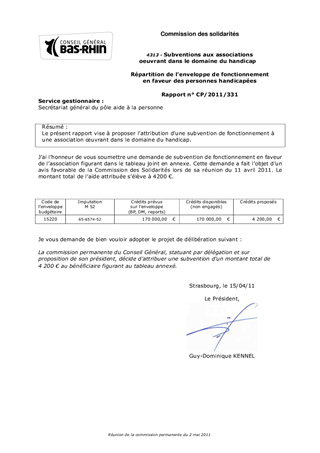 Le présent rapport vise à proposer lattribution d'une subvention de fonctionnement à une association uvrant dans le domaine du handicap.