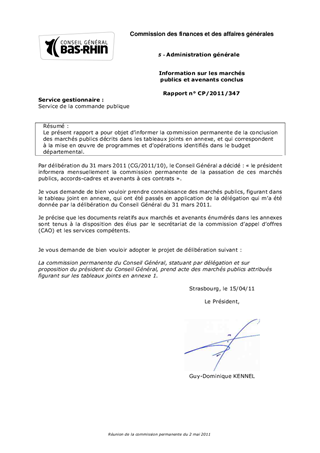 Le présent rapport a pour objet dinformer la commission permanente de la conclusion des marchés publics décrits dans les tableaux joints en annexe, et qui correspondent à la mise en uvre de programmes et dopérations identifiés dans le budget départemental.