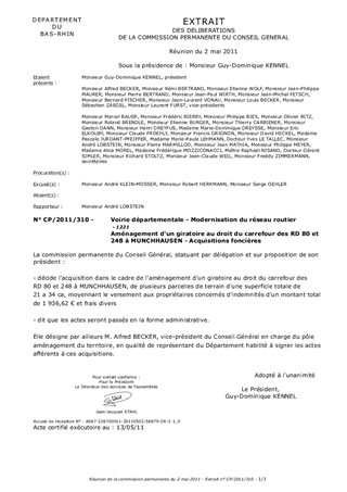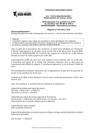 Le présent rapport a pour objet de soumettre à votre approbation les modalités d'indemnisation des acquisitions foncières nécessaires à l'aménagement d'un giratoire au droit du carrefour des RD80 et RD248 à MUNCHHAUSEN.