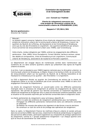 Le présent rapport concerne l'adoption d'une charte de relogement commune aux cinq projets de rénovation urbaine de la communauté urbaine de Strasbourg, à savoir les quartiers du Neuhof, de la Meinau, de Hautepierre et de Cronenbourg à Strasbourg ainsi que du site des Hirondelles à Lingolsheim. Ces quartiers bénéficient par ailleurs d'une convention de renouvellement urbain avec l'ANRU, sauf Cronenbourg. Cette charte, rendue obligatoire par l'ANRU, précise les engagements des différents partenaires : Etat, ANRU, Union Européenne, Conseil Général, bailleurs sociaux, caisse des dépôts et consignations, Villes de Strasbourg et de Lingolsheim, Communauté urbaine de Strasbourg, associations de locataires et Foncière Logement.