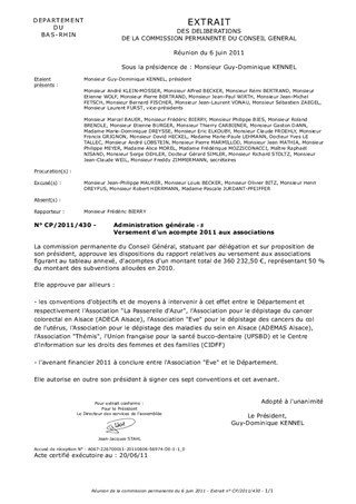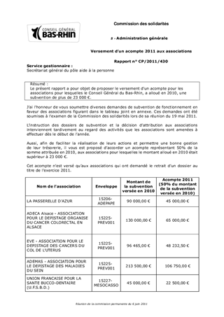 Le présent rapport a pour objet de proposer le versement dun acompte pour les associations pour lesquelles le Conseil Général du Bas-Rhin, a alloué en 2010, une subvention de plus de 23 000 €.