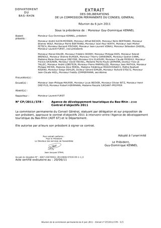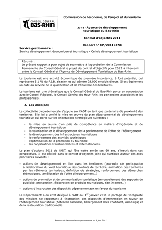 Le présent rapport a pour objet de soumettre à l'approbation de la Commission Permanente du Conseil Général le projet de contrat d'objectifs pour 2011 à intervenir entre le Conseil Général et l'Agence de Développement Touristique du Bas-Rhin.