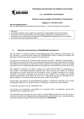 Le présent rapport a pour objet de soumettre à l'approbation de la Commission Permanente du Conseil Général une participation financière du Département à la réalisation d'une pépinière d'entreprises à STRASBOURG-Hautepierre et à la création d'un commerce de proximité à LOHR.