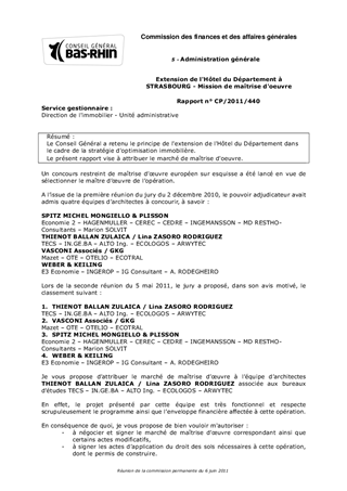 Le Conseil Général a retenu le principe de l'extension de l'Hôtel du Département dans le cadre de la stratégie d'optimisation immobilière. Le présent rapport vise à attribuer le marché de maîtrise d'oeuvre.