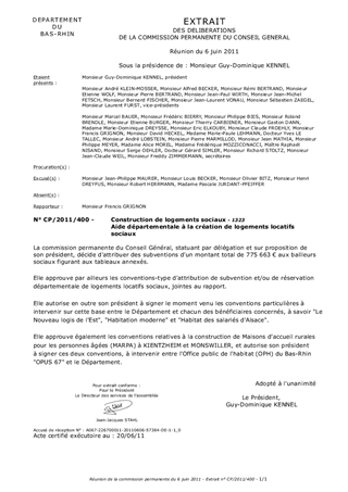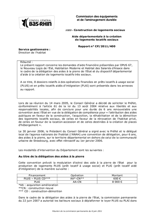 Le présent rapport concerne les demandes daide financière présentées par OPUS 67, le Nouveau Logis de lEst, Habitation Moderne et Habitat des Salariés dAlsace dans le cadre de la délégation des aides à la pierre de lEtat et du dispositif départemental daide à la création de logements locatifs très sociaux. A ce titre, 8 dossiers relatifs à des opérations financées en prêts locatifs à usage social (PLUS) et en prêts locatifs aidés dintégration (PLAI) sont présentés dans les annexes au rapport.