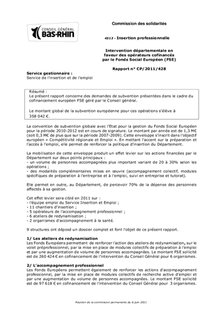 Le présent rapport concerne des demandes de subvention présentées dans le cadre du cofinancement européen FSE géré par le Conseil général. Le montant global de la subvention européenne pour ces opérations sélève à 358 042 €.