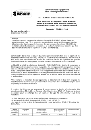Le présent rapport concerne lattribution dune aide à OPUS 67 afin de libérer un appartement de type T 3 et permettre son attribution à une famille relevant du plan départemental d'action pour le logement des personnes défavorisées (PDALPD). La mutation est rendu nécessaire en raison de la perte d'autonomie du locataire qui doit désormais habiter dans un logement adapté à son handicap.