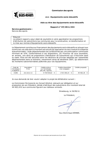 Le présent rapport a pour objet de soumettre à votre approbation les propositions dattribution de subventions aux communes pour la construction, la transformation et la mise aux normes déquipements socio-éducatifs.