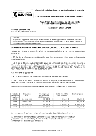 Le présent rapport a pour objet de soumettre à votre approbation différents dossiers de demandes daides financières départementales dans le cadre de la protection et la valorisation du patrimoine protégé.