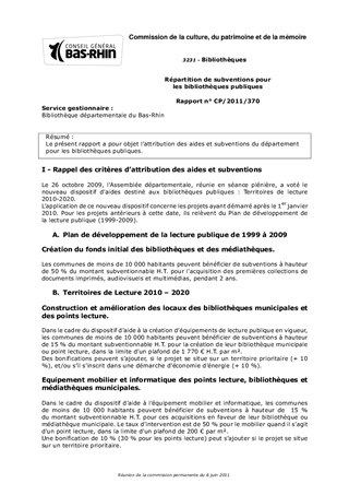 Le présent rapport a pour objet lattribution des aides et subventions du département pour les bibliothèques publiques.
