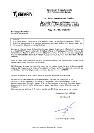 Le présent rapport concerne la mise au point d'une convention permettant à l'ADEUS de traiter les données de la caisse d'allocations familiales du Bas-Rhin dans le cadre de l'observatoire départemental de l'habitat.
