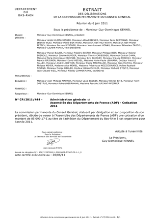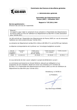Ce rapport a pour objet le versement dune cotisation à lAssemblée des Départements de France (ADF) au titre de ladhésion du Département du Bas-Rhin à cette association pour lannée 2011.