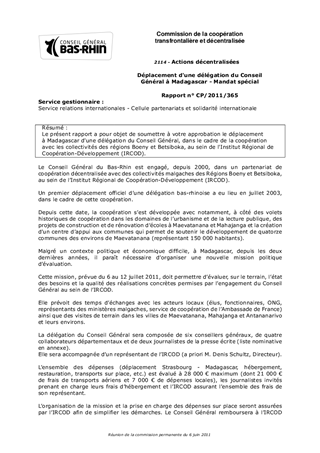 Le présent rapport a pour objet de soumettre à votre approbation le déplacement à Madagascar d'une délégation du Conseil Général, dans le cadre de la coopération avec les collectivités des régions Boeny et Betsiboka, au sein de l'Institut Régional de Coopération-Développement (IRCOD).