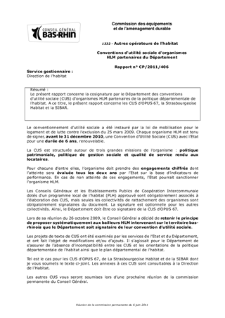 Le présent rapport concerne la cosignature par le Département des conventions d'utilité sociale (CUS) d'organismes HLM partenaires de la politique départementale de l'habitat. A ce titre, le présent rapport concerne les CUS d'OPUS 67, la Strasbourgeoise Habitat et la SIBAR.