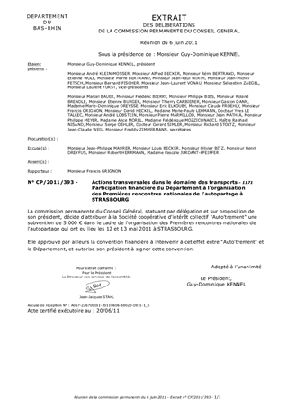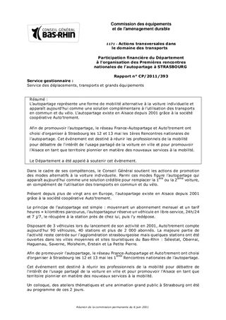 Lautopartage représente une forme de mobilité alternative à la voiture individuelle et apparaît aujourdhui comme une solution complémentaire à lutilisation des transports en commun et du vélo. Lautopartage existe en Alsace depuis 2001 grâce à la société coopérative Autotrement. Afin de promouvoir lautopartage, le réseau France-Autopartage et Autotrement ont choisi dorganiser à Strasbourg les 12 et 13 mai les 1ères Rencontres nationales de lautopartage. Cet évènement est destiné à réunir les professionnels de la mobilité pour débattre de l'intérêt de l'usage partagé de la voiture en ville et pour promouvoir l'Alsace en tant que territoire pionnier en matière des nouveaux services à la mobilité. Le Département a été appelé à soutenir cet évènement.