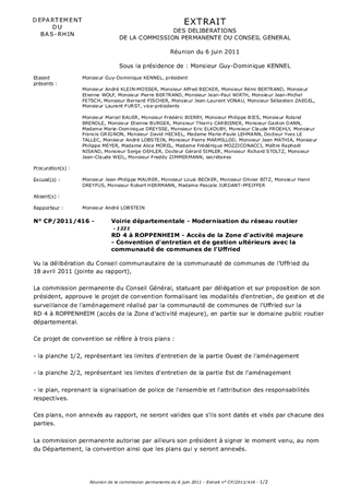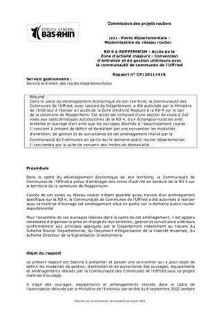 Dans le cadre du développement économique de son territoire, la Communauté des Communes de l'Uffried, avec l'accord du Département, a été autorisée par le Ministère de l'Intérieur à réaliser un accès de la Zone d'Activité Majeure à la RD 4 sur le ban de la commune de Roppenheim. Cet accès est composé d'une section de route à 2x2 voies aux caractéristiques autoroutières de la RD 4, d'un échangeur-lunettes avec bretelles et ouvrage d'art ainsi que les ouvrages destinés à l'assainissement routier. Il convient à présent de définir et formaliser par une convention les modalités d'entretien, de gestion et de surveillance de cet aménagement réalisé par la Communauté de Communes en partie sur le domaine public routier départemental. Il conviendra par la suite de convenir des limites de domanialité.