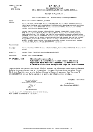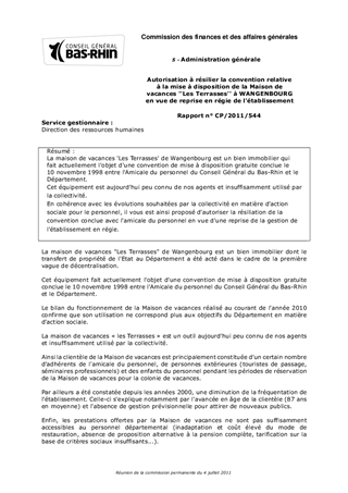 La maison de vacances 'Les Terrasses' de Wangenbourg est un bien immobilier qui fait actuellement l'objet d'une convention de mise à disposition gratuite conclue le 10 novembre 1998 entre l'Amicale du personnel du Conseil Général du Bas-Rhin et le Département. Cet équipement est aujourdhui peu connu de nos agents et insuffisamment utilisé par la collectivité. En cohérence avec les évolutions souhaitées par la collectivité en matière d'action sociale pour le personnel, il vous est ainsi proposé d'autoriser la résiliation de la convention conclue avec l'amicale du personnel en vue d'une reprise de la gestion de l'établissement en régie.